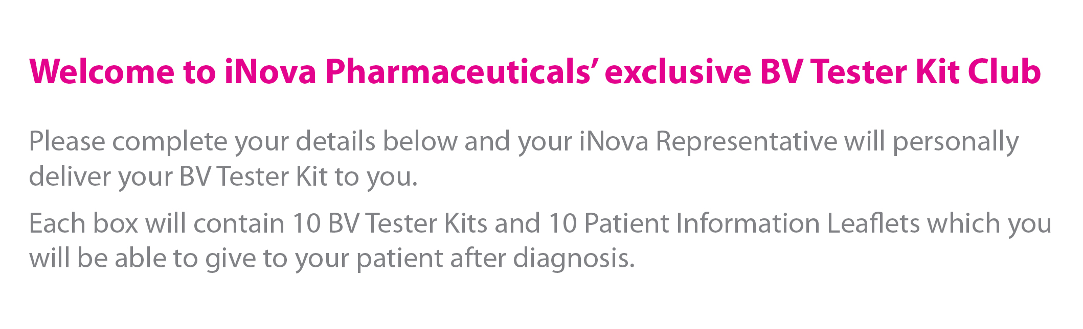 Name Surname MP / SANC number Practice / Pharmacy name Practice / Pharmacy address Contact telephone number Delivery Address iNova Pharmaceuticals representative's name Number of kits required