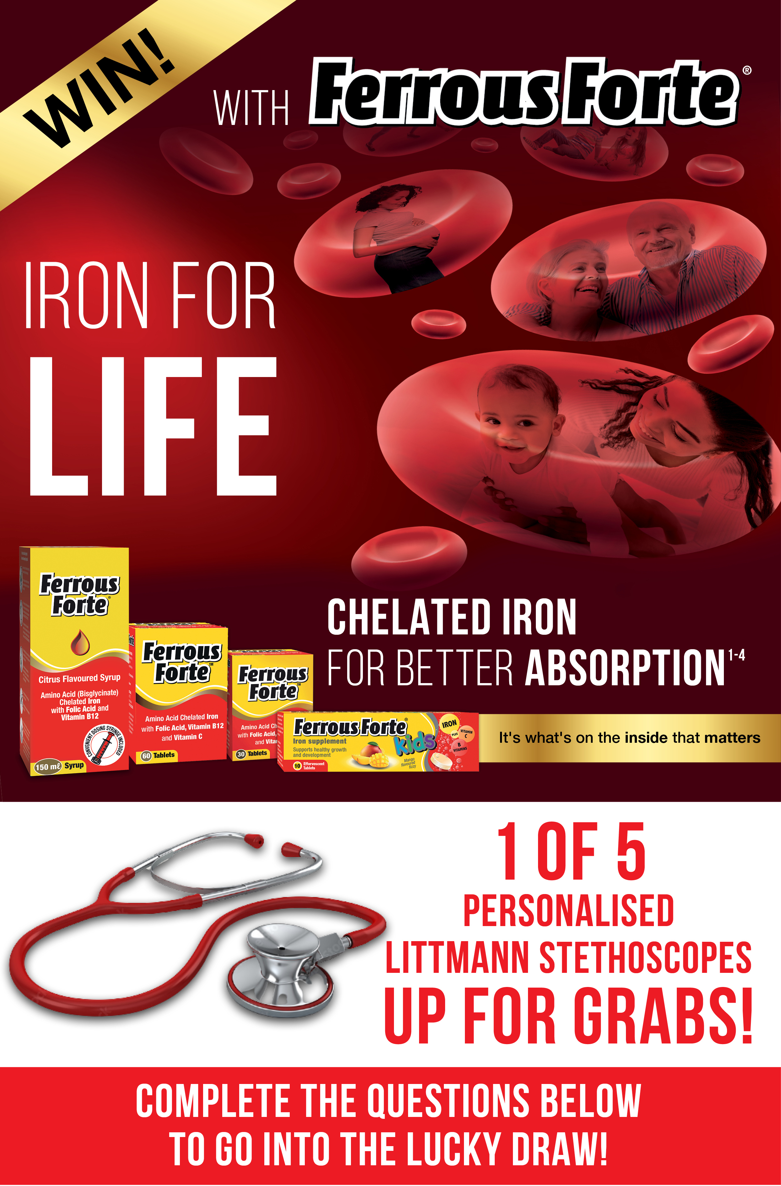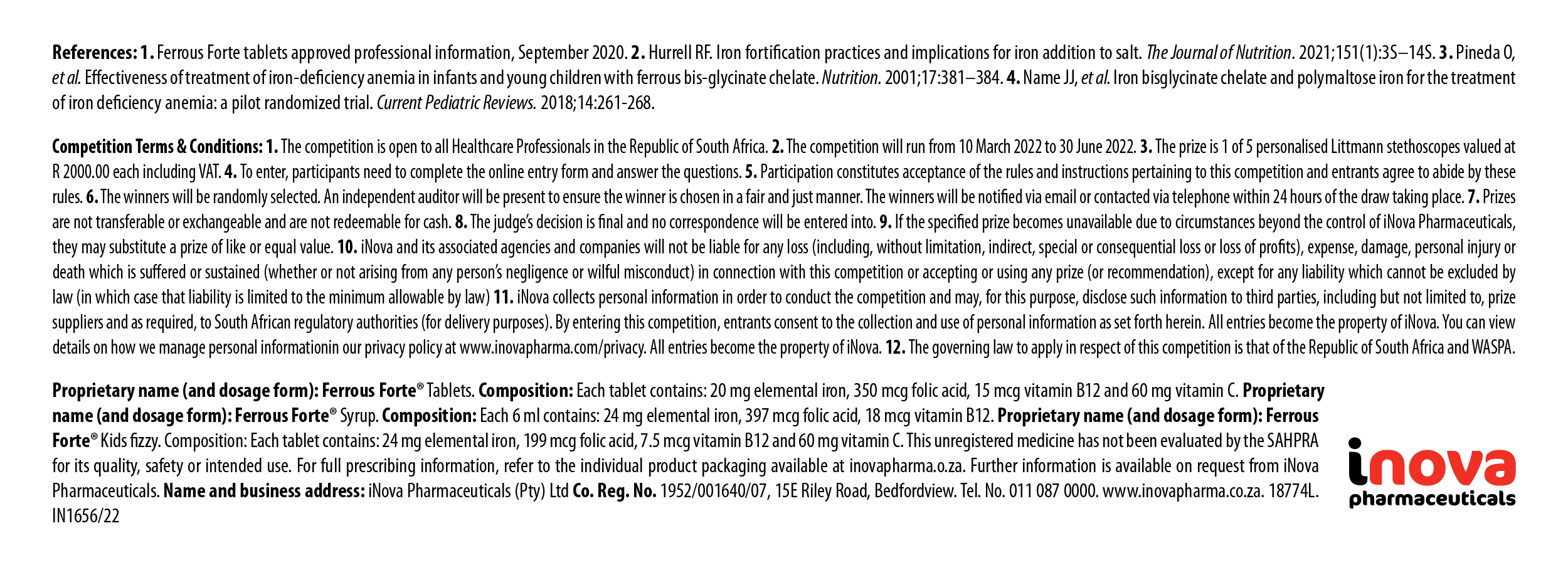Name: Surname: MP number: Contact number: Email address: Practice address: 1. List 2 benefits of ferrous bisglycinate chelate: 2. How does Ferrous Forte® help patients live their best life? 3. List the 3 different Ferrous Forte® formulations available: Privacy Statement. We respect your privacy. Any personal information you have provided will be collected and used for the primary purpose set out above. You can view details on how we manage personal information in our privacy policy at www.inovapharma.com/privacy.