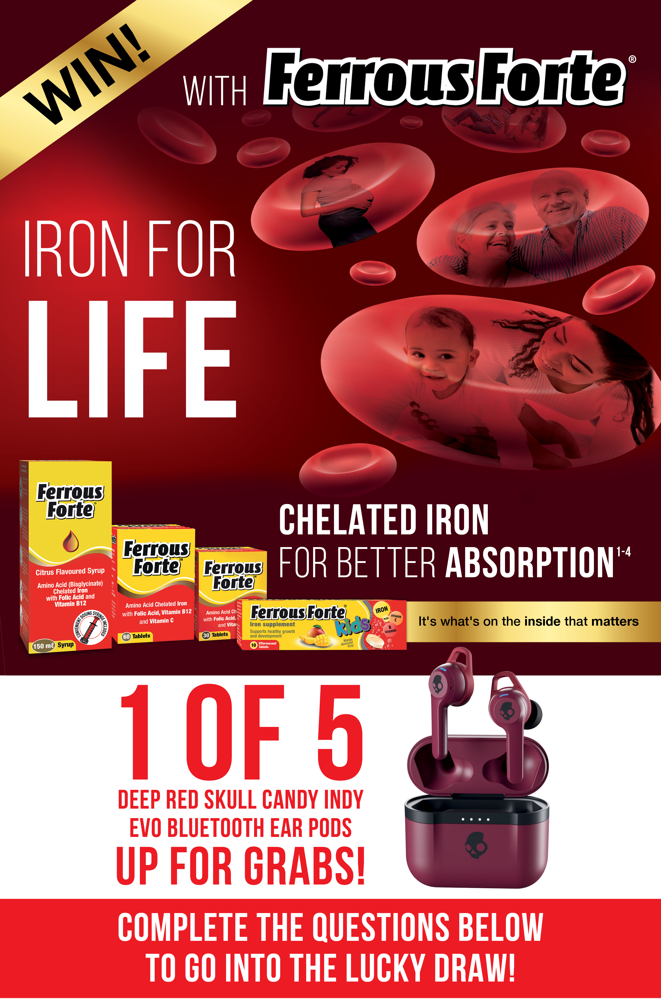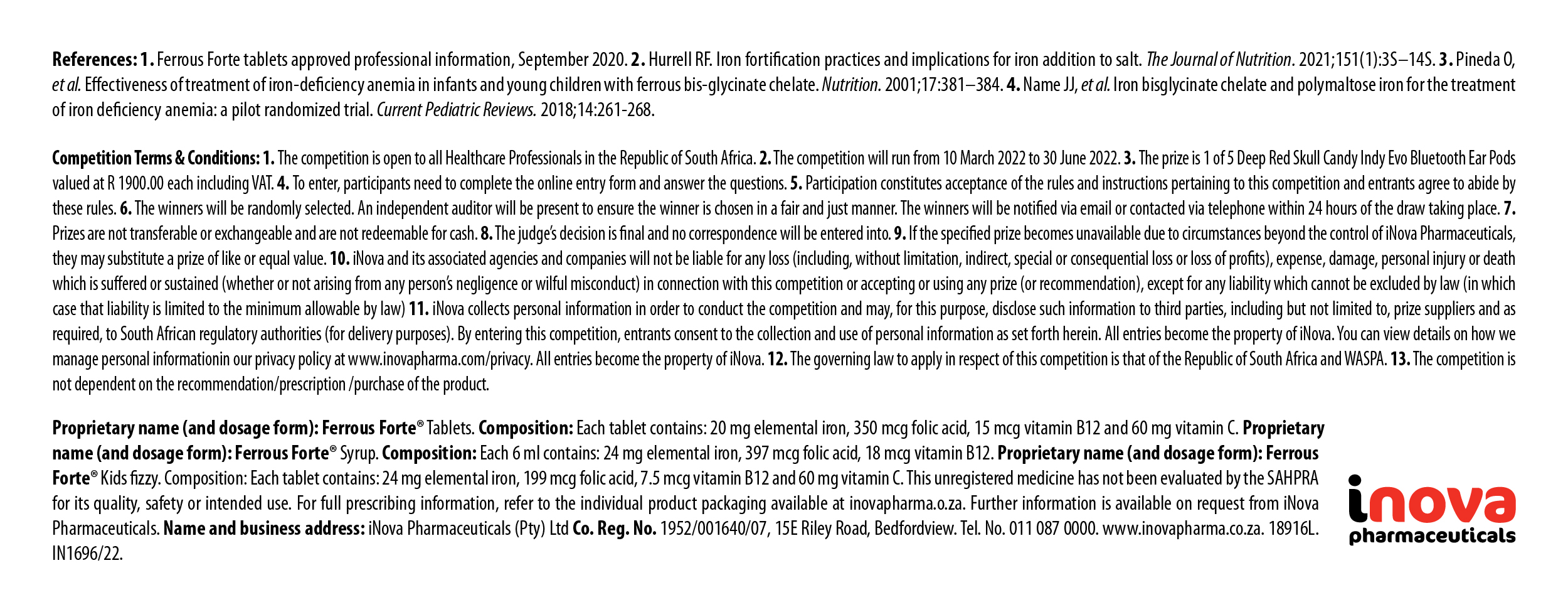 Name: Surname: Contact number: Email address: Pharmacy name: Pharmacy address: 1. List 2 benefits of ferrous bisglycinate chelate: 2. How does Ferrous Forte® help patients live their best life? 3. List the 3 different Ferrous Forte® formulations available: Privacy Statement. We respect your privacy. Any personal information you have provided will be collected and used for the primary purpose set out above. You can view details on how we manage personal information in our privacy policy at www.inovapharma.com/privacy.