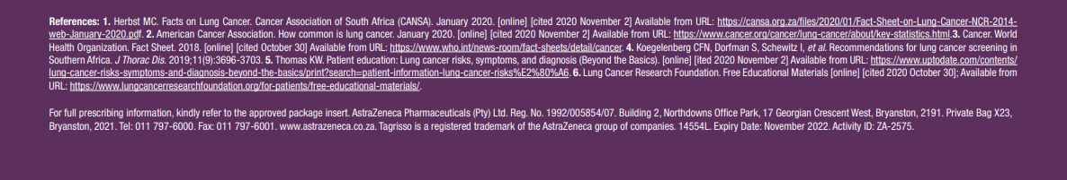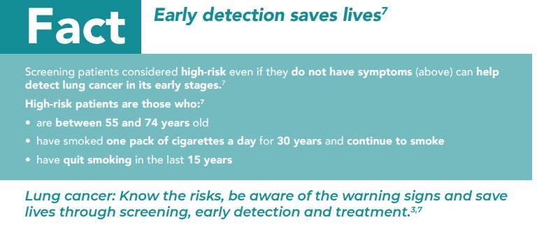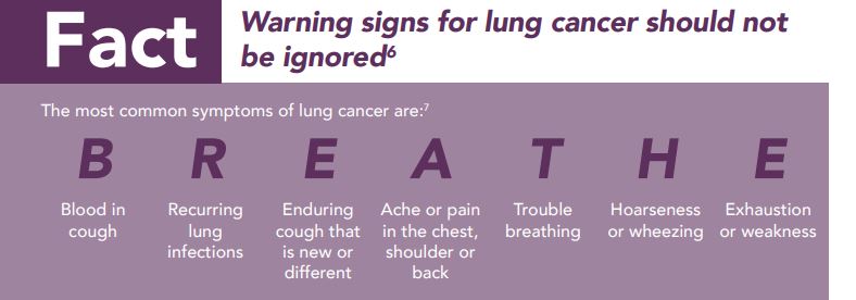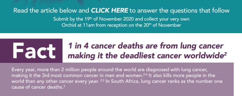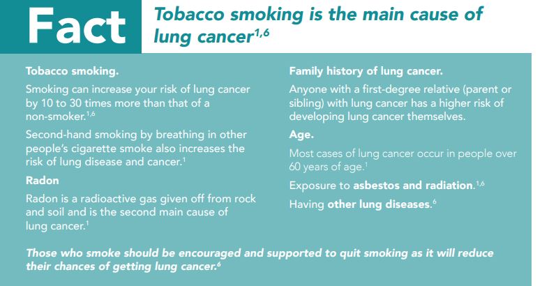 Name: Surname: Contact Number: E-mail: 1. Which of the following is the main cause of lung cancer?1,b,c,5a a. Tobacco smoking b. Age c. Family history d. None of the above 2. Lung cancer: (Multiple answers) 2a, b, 3a, b, 1a a. Kills more people every year than any other cancer. b. Develops when the cells in the lungs grow out of control c. Affects men only d. B, C are correct 3. Those at high-risk of getting lung cancer are those: 6c a. Between 55 and 74 years of age b. who smoke or have smoked one pack of cigarettes a day for the last 30 years c. who have stopped smoking in the last 15 years d. All of the above 4. Even if you do not smoke, breathing in second-hand smoke can increase your risk for lung cancer.1d True False 5. Which of the following statements are true? (Multiple answer) 6a, 3c, 6b, 5a, 1g a. Coughing up blood is one of the common symptoms of lung cancer b. Lives can be saved through awareness of risks, symptoms and early screening c. Age is a risk factor for lung cancer d. All of the above