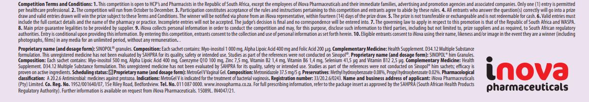 Name Surname MP / SAPC Number Practice / Pharmacy Name Contact Telephone Number Email Address iNova Pharmaceuticals Representative's Name SINOPOL® AND SINOPOL® HIM: 1) Sinopol® assists in correcting imbalances related to: A. Insulin resistance B. Hyperandrogenism C. Oxidative stress D. PCOS associated fertility E. All of the above 2) Sinopol® him helps correct imbalances associated with: A. Oxidative stress B. Sperm quality C. Testosterone D. Insulin resistance E. All of the above 3) Sinopol® and Sinopol® him - ______ -_______ technology ensures 24 hour cover 4) What is the dosage for Sinopol® and Sinopol® him? 5) List the active ingredients for Sinopol® METROGEL® V:1) BV is the MOST COMMON vaginal infection and represents _____% of cases. 2) Who recommends MetroGel® V for treating BV, includingrecurrent BV? 3) As an antibacterial agent, MetroGel V shows _______to_______ resistance. 4) MetroGel® V targets anaerobic bacteria and preserves protectiveLactobacilli. True False 5) MetroGel® V reduces systemic exposure by ______ andimproves tolerability.